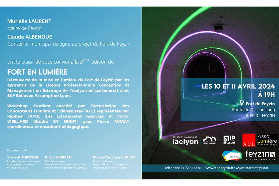 Face au succès des deux premières éditions, l’événement ? FORT EN LUMIERE ? revient. Les 10 et 11 avril, les 20 apprentis de Licence Professionnelle Conception et Management en Eclairage vont illuminer l’ancienne forteresse militaire et ses espaces extérieurs. Des lieux emblématiques du Fort comme les salles souterraines ou encore la salle des Machines seront mises à l’honneur. Une promenade d'une heure environ permettra au public de parcourir l'ensemble de ces installations lumineuses éphémères.